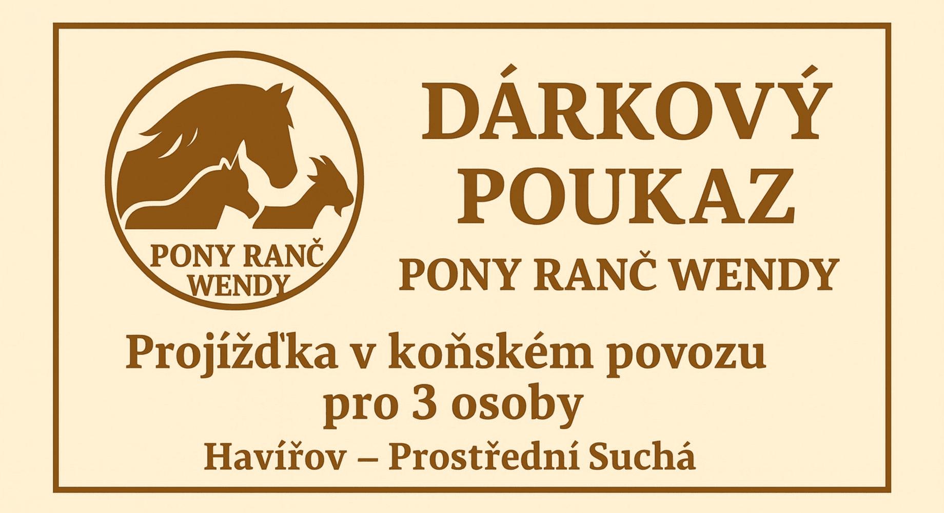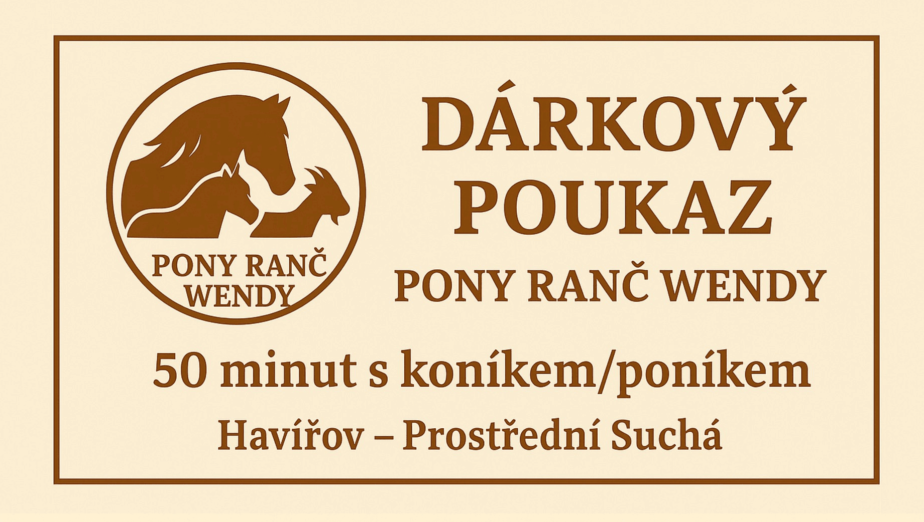 U nás na Pony ranči Wendy si můžete zakoupit dárkové poukazy – třeba na hodinovou projížďku v koňském povozu nebo 50 minut s koníkem/poníkem.